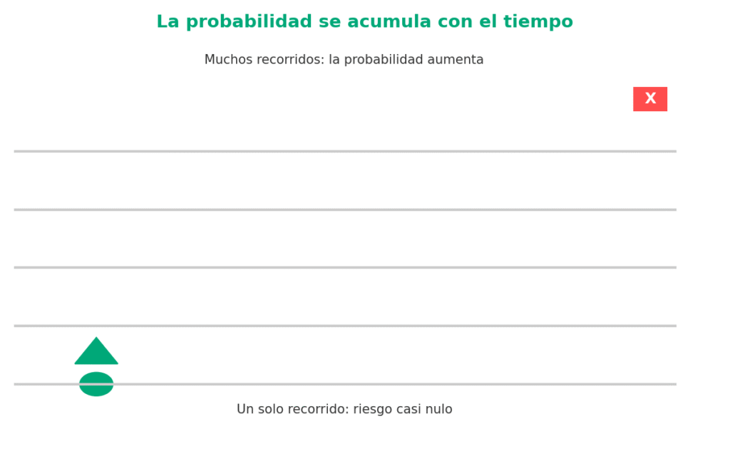 Imagina que decides correr al gimnasio todos los días. Sabes que probablemente llegarás bien, pero también existe la posibilidad, aunque pequeña, de tener un accidente en el camino. Si lo haces una sola vez, el riesgo es casi nulo. Pero si lo repites durante 40 años, tarde o temprano esa probabilidad se materializa.